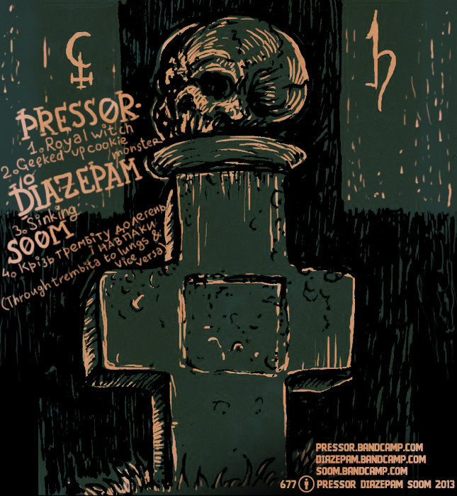 Soom est peut être le plus différent des trois confrères, plus psychédélique, plus monolithique, avec une voix claire, et un son qui fait encore plus grésiller les enceintes, si c'était possible. Ils signent ici leur premier enregistrement, et l'on pense un peu à Suma, peut être à cause du nom du groupe, mais avant tout à cause du style. Mais le fait est que, plus on progresse dans l'écoute de ce split, plus on creuse sous terre : lisez vous même la tracklist, vous verrez, à la fin c'est carrément marqué en Russe. Ce "Крізь трембіту до легень і навпаки" (ne me demandez pas de le prononcer) est une chappe de plomb, un riff unique qui plombe encore plus la fin de ce split.